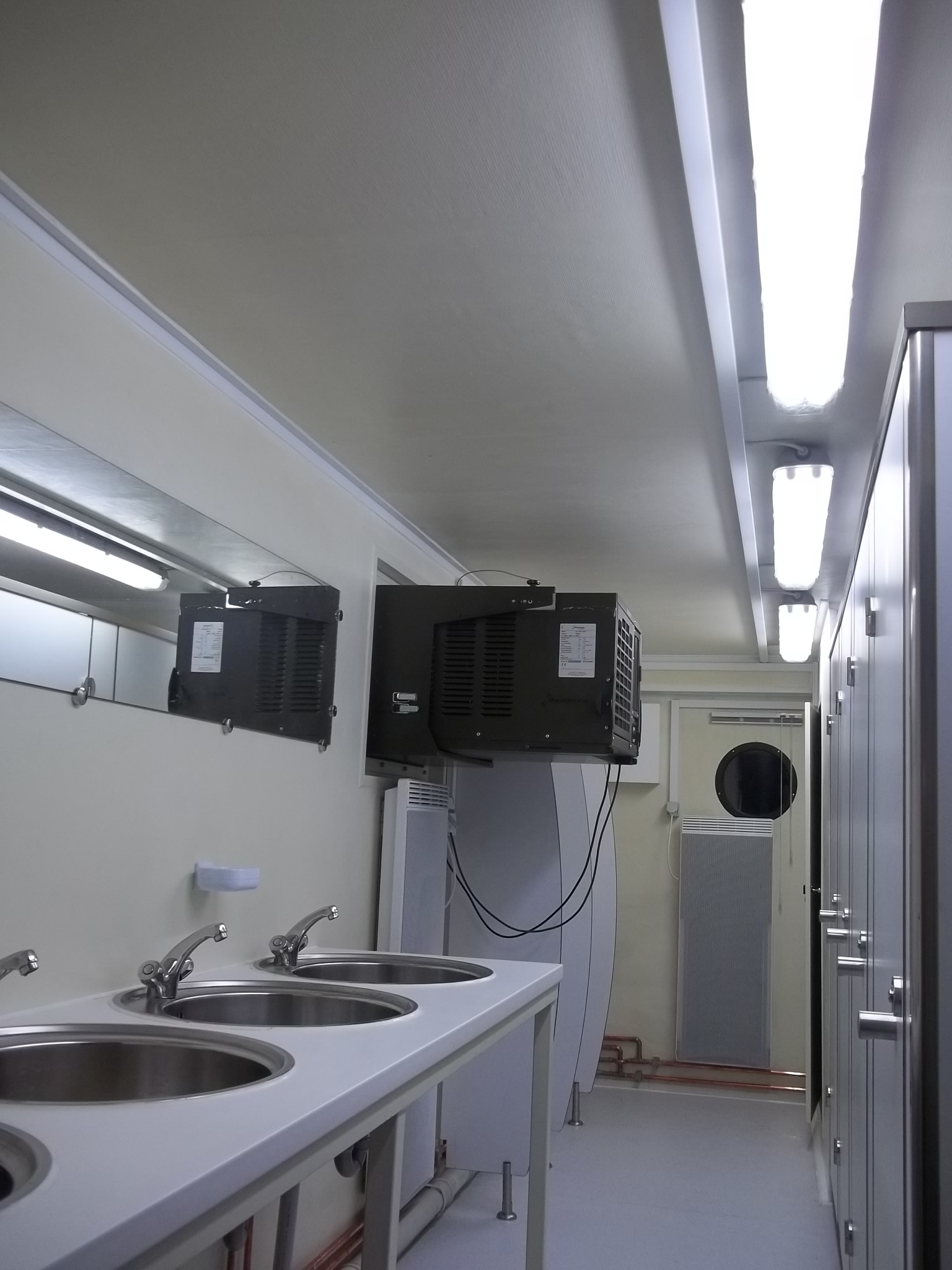Shower-type containers house up to 8 shower cabins, sinks, as well as an autonomous hot water production system. Toilet-type containers are designed in unisex or mixed versions with two compartments with separate entrances. They house 4 to 5 toilet cabins, urinals, and sinks.
