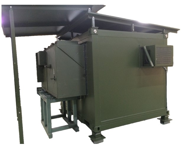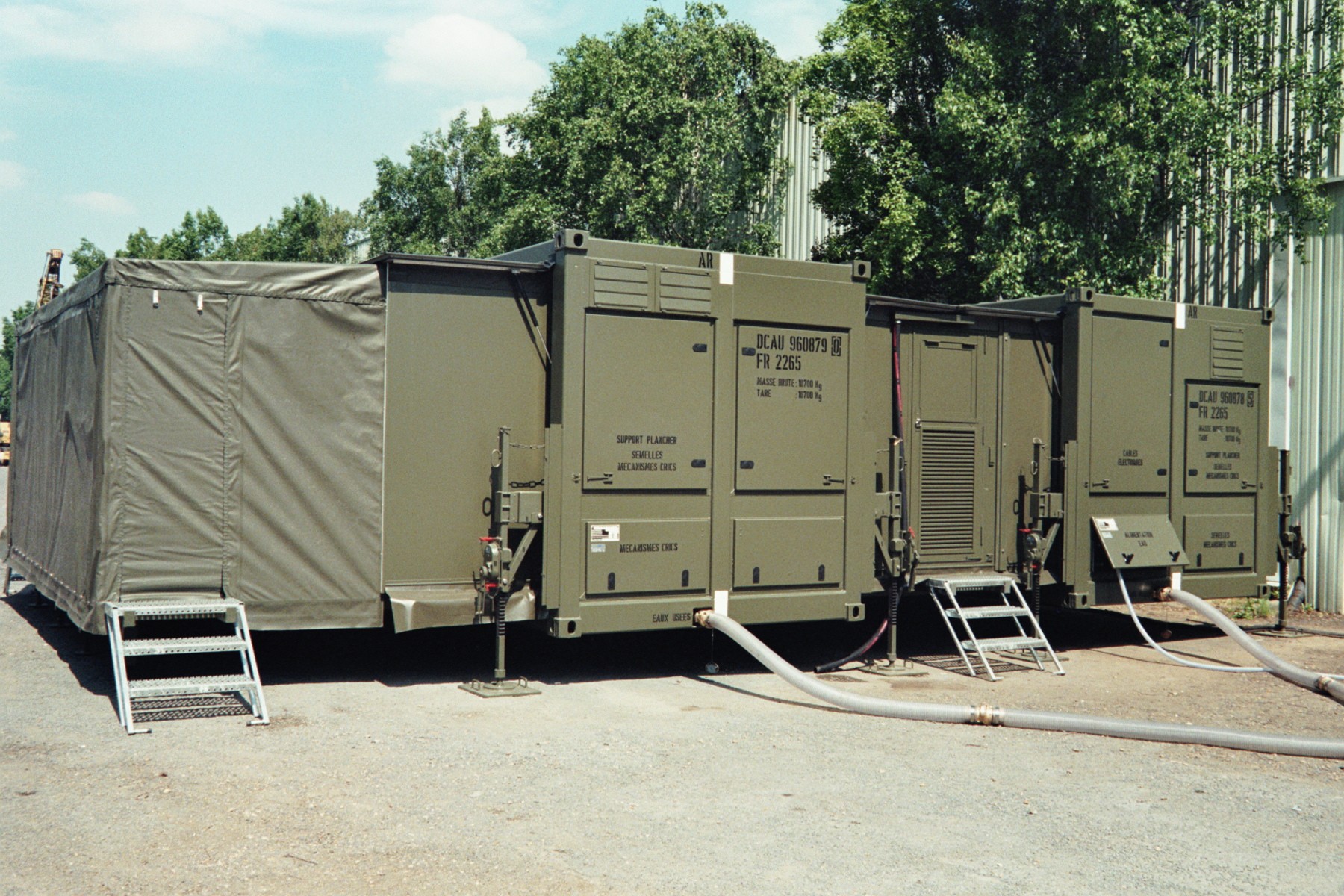 The self-contained laundry container quickly provides significant washing and drying capacity on the theatre of operations. It is self-sufficient in energy thanks to an integrated electric generator but can be powered by the local electrical network. It is equipped with its own pump, hot water generator, and hydraulic connection network. It can be connected to either the network or a tank container.