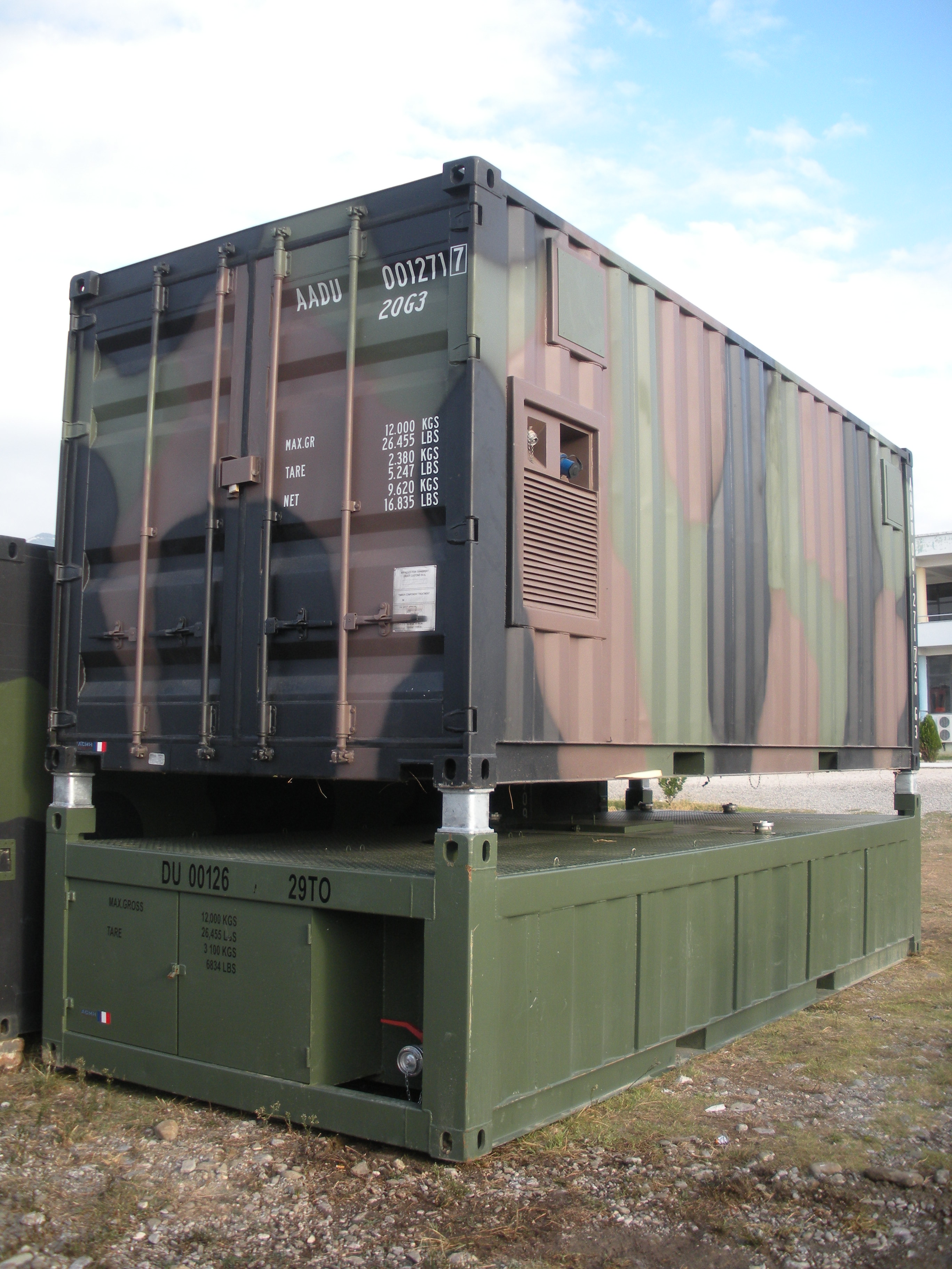 The container, in transport configuration, complies with ISO 20-foot requirements and is compatible with intermodal transport.