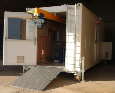 Heavy lifting (around 1000 kg) is possible thanks to overhead cranes or a telescopic rail with a hoist. The container complies with ISO 20-foot requirements and is compatible with intermodal transport.