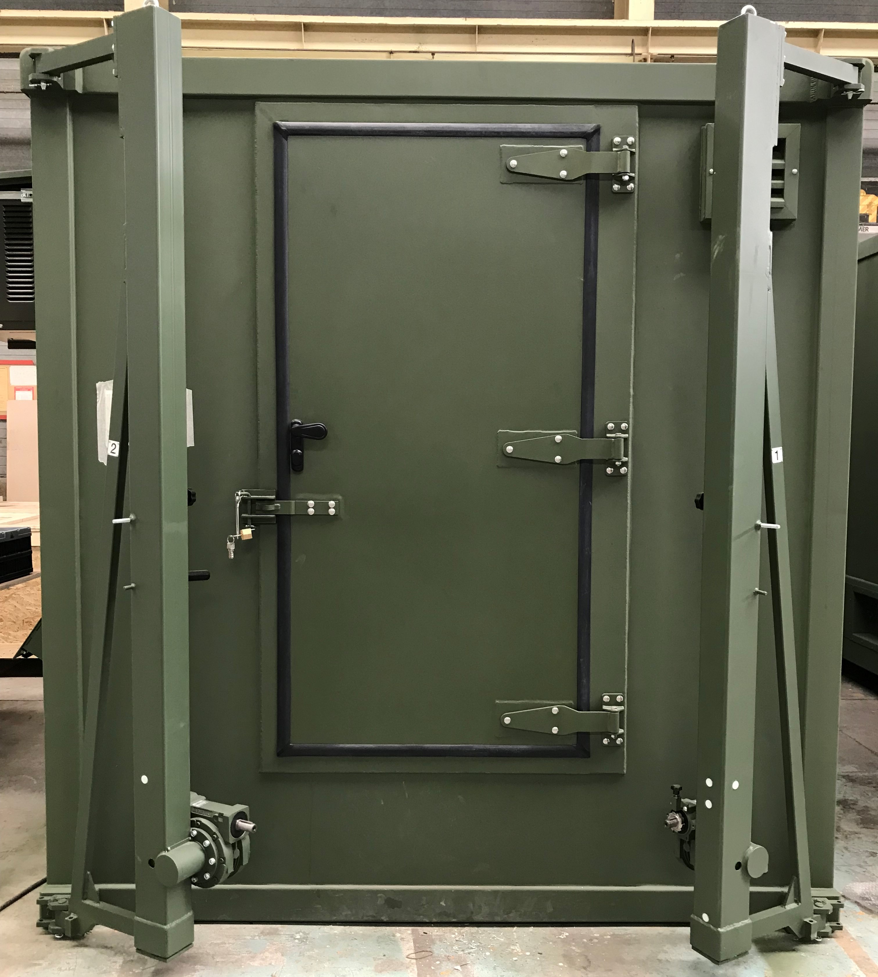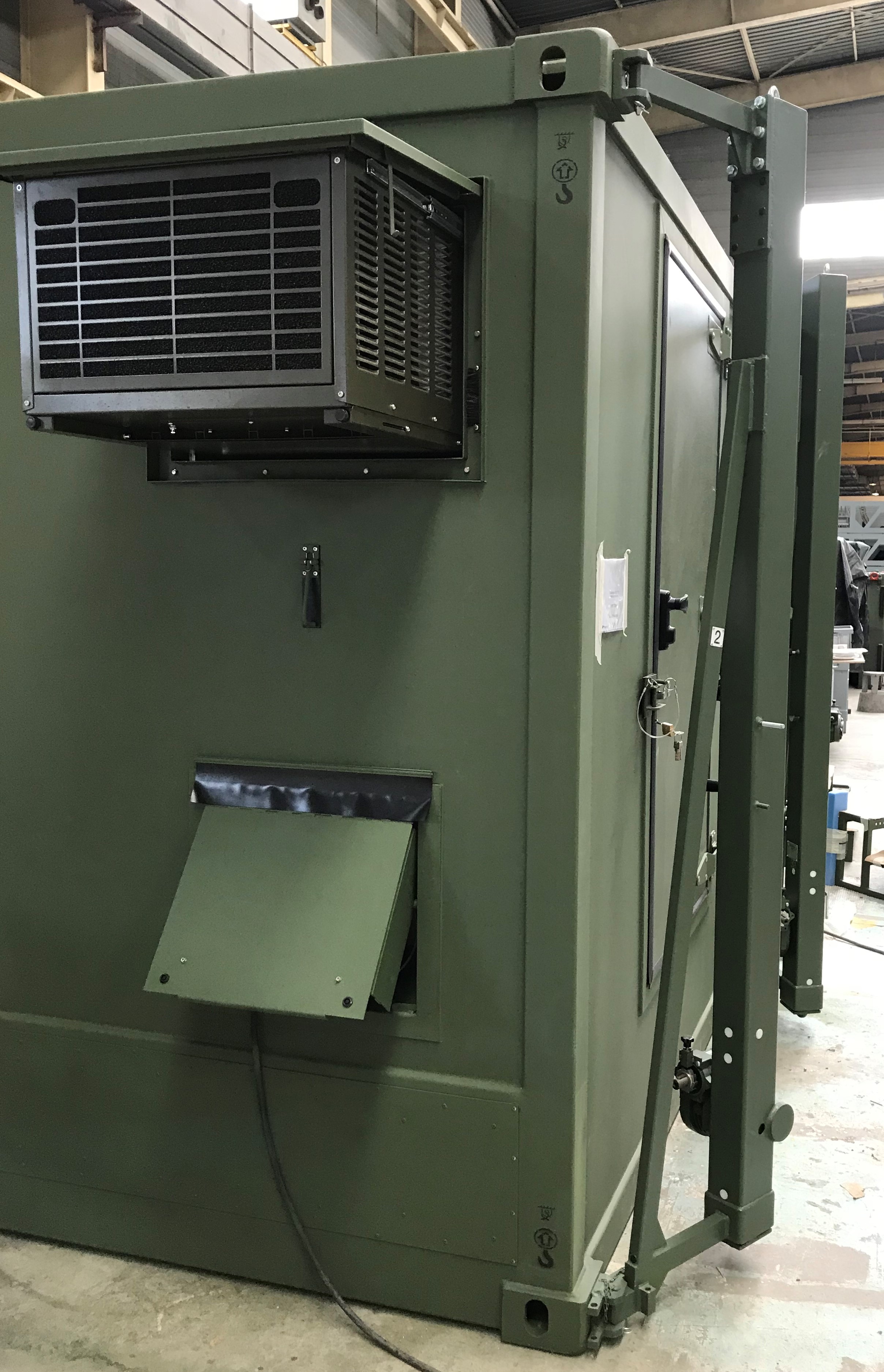 The container's welded mechanical structure has numerous fastening interfaces. The operational compartment provides the space and equipment needed for operators to carry out their missions.
