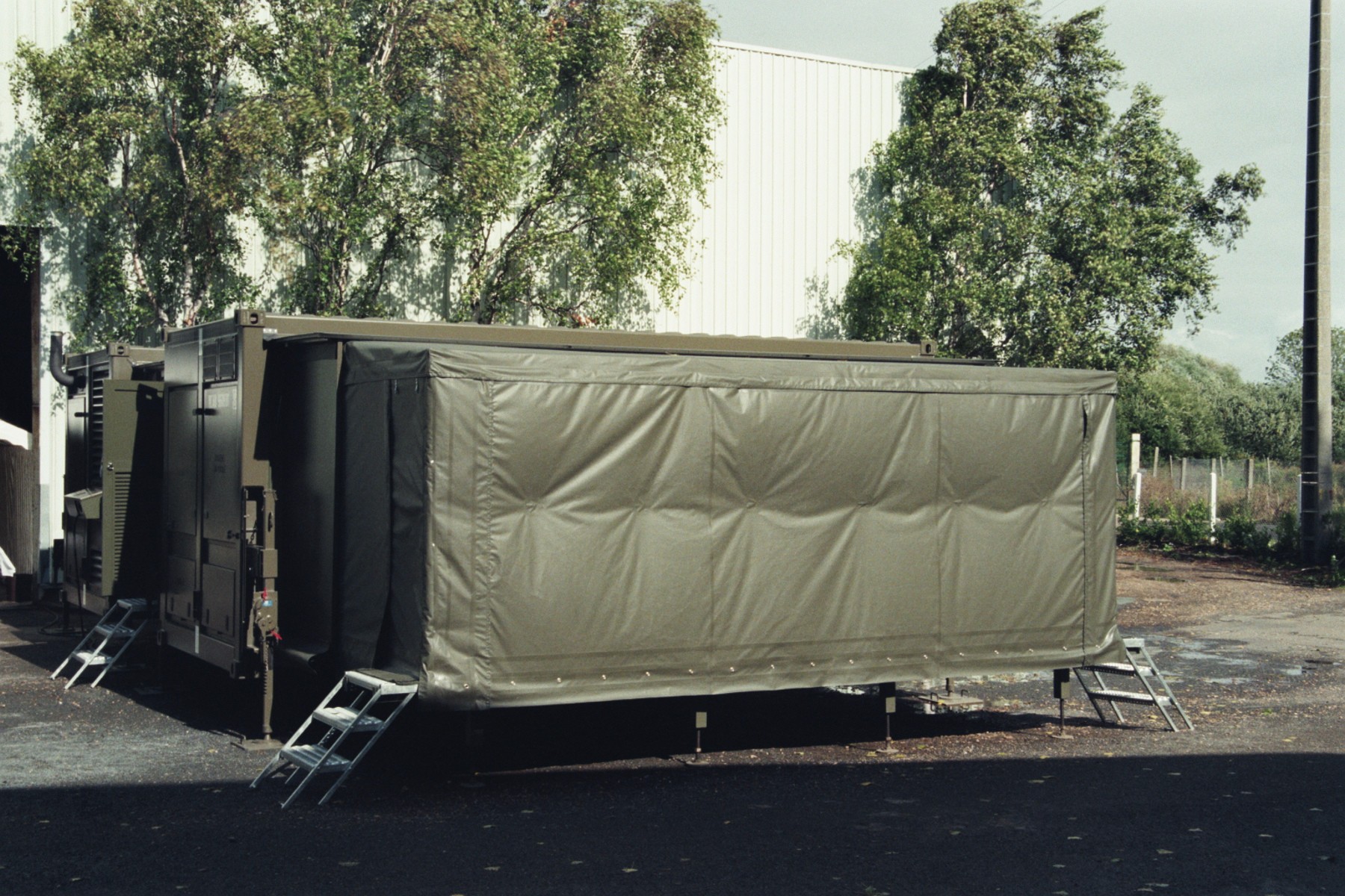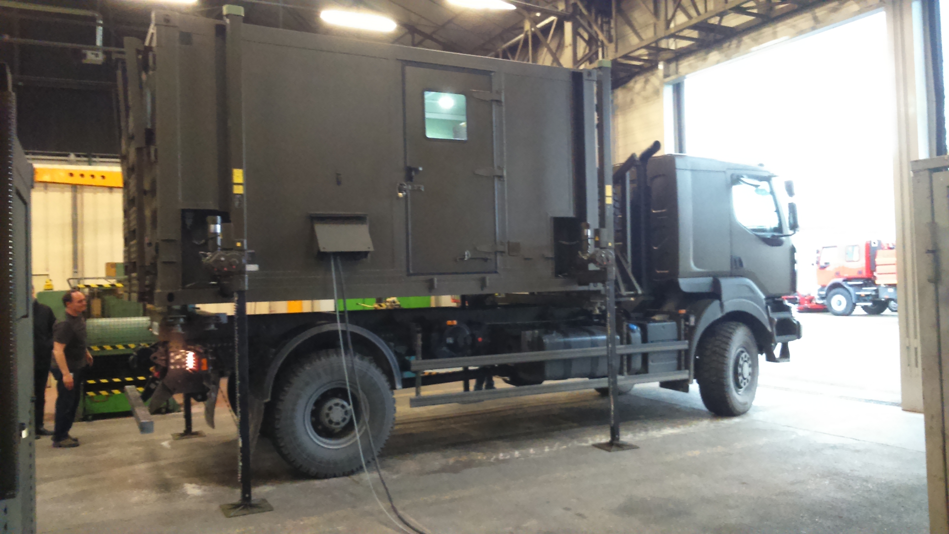 The container is quickly operational, either on its carrier or unloaded using its integrated electric jacks. The workshop container is self-sufficient in energy, includes a welding station, grinder, drill press, small metalworking tools, workbenches for tool and spare parts storage.